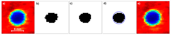 C-scan of the 6 mm hole during processing: raw (a), binarization (b), filtration (c), finding the circle with circular Hough transform (d), and the circle marked on the original image (e).