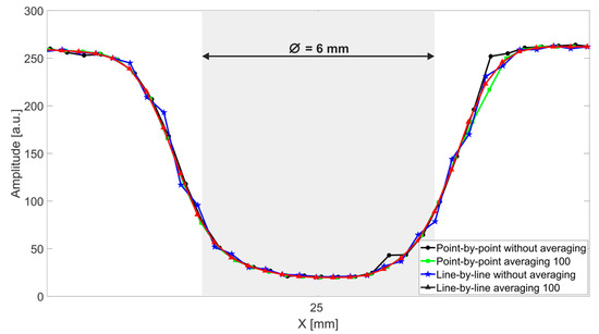 For an even more detailed comparison of the four scanning schemes under consideration, the peak-to-peak amplitude of the terahertz signal reflected along the line passing through an arbitrarily selected M6 hole is shown (Figure 9).