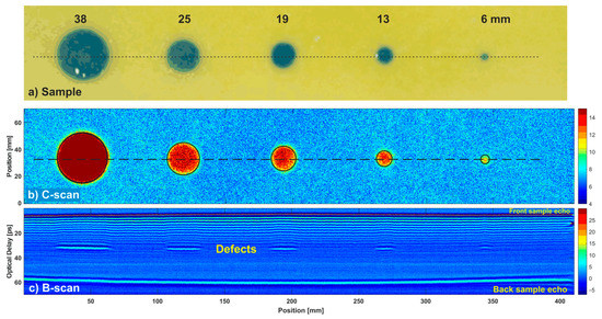 Figure 10b presents a C-scan of the sample measured in the line-by-line approach (without averaging), calculated as peak-to-peak in the time slice. The time slice range 41–46 ps (depicted in Figure 11a) was selected arbitrarily to optimally show the defects. Each defect was marked with a circle, whose radius was taken from the real defect (Figure 10a), while the center was determined with the circular Hough transform described in Section 3. Figure 10c shows a B-scan presented for the line passing through the centers of the circles (see Figure 10b). In both figures, all defects are clearly seen. The visibility can be improved by the filtering of the signals in the time domain.