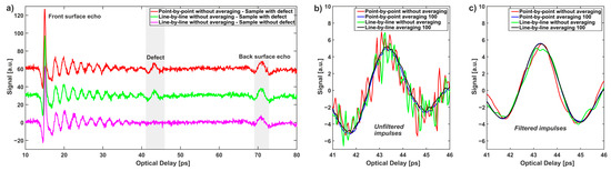 Figure 11b and c show the magnification of the impulse related to the defect in the four acquisition modes under consideration: raw and after filtering with a band pass filter with a low frequency of 0.1 THz and a high frequency of 1 THz, respectively. The noise level of both raw signals is significantly but similarly high, but, after filtration, all pulses are consistent in relation to their shape, amplitude, and duration.