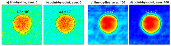 Finally, Figure 12 presents C-scans (peak-to-peak in the time slice mode) for the area with the defect with the diameter of 19 mm obtained for four acquisition modes. For a qualitative assessment, we calculated the sum of all pixels inside the circles. The obtained values differed by around 3–5% between corresponding images, which proves their good similarity.