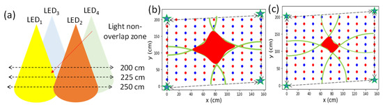 It is generally consider that the performance of VLIP systems would decrease if the separation between the LED and the Rx increases due to the reduction of the optical signal-to-noise ratio (SNR). However, owing to the finite LED lamp FOV, light non-overlap zones are created. These light non-overlap zones could be large and could introduce high positioning error since no light can be detected at these zones as shown in Figure 3a. Figure 3b,c are the top views of the illuminated areas at the 200 and 225 cm Rx planes away from the LED plane, respectively. We can observe that the light non-overlap zone (red region) is bigger at the 200 cm plane, and the illuminated zones (green line regions) of the four LEDs are smaller.
