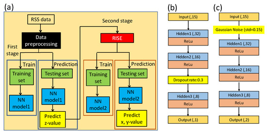Figure 5a shows the flow diagram of TSNN model for the 3D VLIP system. The first stage of the TSNN is almost the same as the one stage NN model and the difference is on the structure of the NN model as illustrated in Figure 5b. The nodes of output layer in the first stage of the TSNN is changed to 1 representing the z coordinate, and we use a dropout layer (rate = 0.3) instead of Gaussian noise layer to avoid over-fitting. The optimizer and loss function are the same, but the training epoch is 400. After the prediction of the z coordinate, the proposed RISE (i.e., red block in Figure 5a) is executed. The details of the RISE will be discussed later in this section. After the RSS data enhancement, the data will be proceeded by the second stage of the TSNN. The structure of the second stage of the TSNN model is illustrated in Figure 5c. The nodes of input layer are still 15, which consist of the 14 terms from the second-order transformation and the predicted z coordinate from the first stage of TSNN. The standard deviation in Gaussian noise layer is increased to 0.15, and the nodes of output layers are 2 which represent the predicted x and y coordinates. The remaining parameters of the second stage TSNN model are the same as the first stage TSNN.