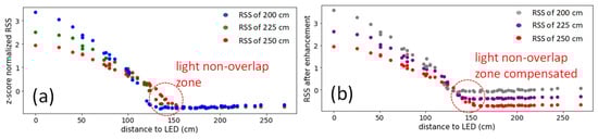 where hstd is the height of the standard (or reference) layer, which is set at the 250 cm Rx plane as discussed before since there is no light non-overlap zone, and htarget is the height of the target layer (i.e., 225 or 200 cm). θ is the divergence angle of the LED lamp, which is set at 32 degrees based on our measurement results. By multiplying the tanθ and the height, we can obtain the size of the illuminated region of the LED lamp at this height which is the denominator. For the numerator, we can calculate the extent to which the LED illuminated region is reduced due to the height. After knowing the reduced ratio at different heights, we will multiply an α to control the compensation level of the RSS value. Figure 6b reveals the RSS distribution after the RISE, illustrating that the light non-overlap zone, particularly around 150 cm, can be compensated. When comparing Figure 6a,b, it can be observed that in Figure 6b, the RSS value at the vertical 200 cm plane is higher than that at the 225 cm plane, and the 250 cm plane around the 150 cm horizontal direction. This illustrates that the light non-overlap zone has been compensated.