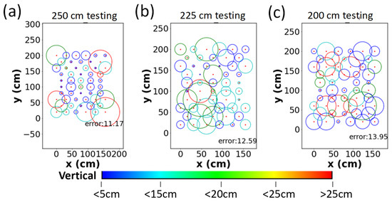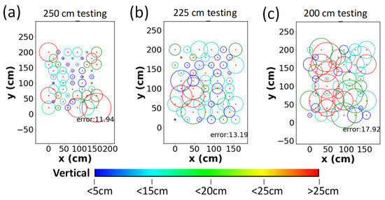 When one stage NN model is employed, the mean and standard deviation of errors for the testing data set in the vertical direction (z-direction) are 11.39 and 9.10 cm, respectively. The mean and standard deviation of errors and for the horizontal direction (xy-direction) are 12.79 and 7.99 cm, respectively. Figure 7a–c show the average error distributions of the testing data set at different Rx planes. The red dots are the location of the testing points. The radius and color of circle represent the average error in the xy- and z-directions, respectively. When the height increases, the average error in the xy-direction becomes larger. The average errors are 11.94, 13.19, and 17.92 cm at the 250, 225, and 200 cm Rx planes, respectively. Moreover, the average error in the z-direction is also large at the 200 cm Rx plane as illustrated by many red circles in Figure 7c.