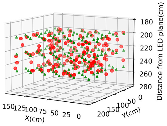Figure 1a,b present the architecture of the experimental setup of the proposed 3D RSS VLIP system. The distance between the ceiling and the floor is ~300 cm. The positioning area has four LED lamps (TOA® LDL030C) with 13 W output power each. Moreover, each LED is encoded by a 3.125 kbit/s Manchester-coded (MC) ID, which is frequency upconverted to specific RF carrier frequency. The RF upconverted signals are used to modulate the LED lamps via bias-tee circuits. The PD (Thorlabs® PDA36A) is attached to a real-time-oscilloscope (RTO, PicoTechnology® ps5432d) for RSS optical signal recording. The PD has the detection wavelength window of 350–1100 nm, and the optical-to-electrical bandwidth from DC—10 MHz. The carrier frequencies are between the bias-tee cut-off frequency (i.e., ~10 kHz) and the LED lamp bandwidth (i.e., ~1 MHz). Hence, we select 47 kHz, 59 kHz, 83 kHz, and 101 kHz. The odd frequencies are used to alleviate overlapping of the harmonic frequencies after the signal detection. We store the training data and testing data from 3 layers at different heights, and the distance is 250, 225, and 200 cm from the LED plane. Figure 1b shows the top-view of the VLIP layer, illustrating the training, testing, and LED locations. In this practical experimental test-bed, the unit cell is not a perfect rectangle, and the size is about 155 cm × 200 cm. For each layer, we measure 112 location points, of which 58 location points are for training and 54 location points are for testing. Each location point is measured by 20 times. Therefore, the training set has a total of 3480 data (58 locations × 20 measurements × 3 layers), and the testing set has 3240 data (54 locations × 20 measurements × 3 layers).