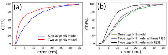 Figure 11a,b present the cumulative distribution function (CDF) of the measured positioning error in the z-direction and xy-direction, respectively, using different NN models. For z-direction, when using the one stage NN model, the positioning error of 90% of the experimental data is within 21 cm; while using the two stage NN model, the error is reduced to 17.6 cm. For xy-direction, when using the one stage NN model, the positioning error of 90% of the experimental data is within 24.2 cm; while using the TSNN model without and with the RISE, the errors are within 21.7 cm and 15.3 cm, respectively. Hence, at the CDF at 90% positioning error, the TSNN model with RISE can reduce the errors by 36.78% when compared with that in the one stage NN model.