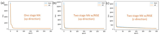 Loss performance during the training and validation processes using (a) one stage NN (xy), (b,c) TSNN with RISE (xy and z).