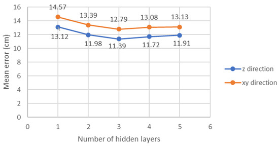 As shown inside the VLP unit cell in Figure 1b, there are 58 training location points and 54 testing location points for each layer (i.e., Rx plane), and there are 3 layers in total. Each location point is measured by 20 times experimentally. Therefore, the training set has a total of 3480 data (58 locations × 20 measurements × 3 layers), and the testing set has 3240 data (54 locations × 20 measurements × 3 layers). We now describe our procedure to reduce the mean positioning error by optimizing the number of hidden layers and number of nodes (i.e., neurons) in each hidden layer. By optimizing these parameters, the complexity of the NN model can be reduced. We use the one stage NN as an example. We use multiples of 16 as the number of nodes in each hidden layer. First, we try a different number of hidden layers as shown in Figure 13. We can observe that using three hidden layers can achieve the lowest mean errors in both the xy- and z-directions. Then, we try several combinations of nodes for the three hidden layers, including (32, 16, 8), (64, 32, 16), (128, 64, 32) … etc. Additionally, by comparing the mean errors in these combinations, nodes (32, 16, 8) has the lowest mean error while using a small number of nodes. Here, a laptop computer with CPU (Intel® i5-8265u), RAM of 20 GB, and Windows 10 home edition is utilized for the model training and validation. The training times for each model is within 50 s. After the NN model has been trained, the location prediction time is within 1 s.