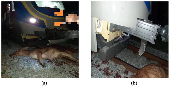 From the information published by the Chinese State Railway Bureau, it can be found that train collisions are mainly divided into inter-train collisions, collisions between trains and buildings, and collisions between trains and intrusions, while train collisions are mostly dominated by the first two types of collisions. Therefore, domestic and foreign research also focuses on inter-train collisions and train–building collisions [2,3,4]. However, in recent years, with high-speed trains and high-speed rail lines being made available to improve the ability to travel, high-speed trains and live intrusion collisions have frequently occurred. Collisions with living bodies will cause serious railroad traffic casualties [5,6,7]. For example, on 2 June 2013, a G38 high-speed train from Hangzhou to Beijing was hit by a flying bird, resulting in a large crack in the front glass, and the train had to make an emergency stop at Nanjing South Station. Unlike China’s high-speed rail lines where railroad protection nets are installed, railroad lines in other countries around the world are generally less protected, and there is a possibility of collision between trains and live intruders in some areas [8]. Figure 1 shows the accident of a high-speed collision between an articulated rolling stock exported to a country in Southeast Asia and a live intruder. The outer cover of the front end of the train was broken, and the anti-crawler and excluder pushed the body of the intruder out of the track after the collision, thereby avoiding the danger of train derailment. This type of rolling stock belongs to the long formation group, the length of the driver’s cab is short, and it is impossible to arrange the regular energy-absorbing elements of the front end [9]. Therefore, it is necessary to conduct an extensive investigation on the safety of high-speed collision between trains and live intruders.