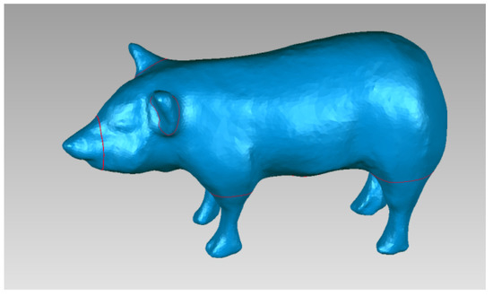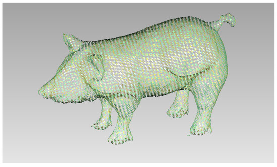 Taking the pig mode as an example, according to the existing standard animal model and its anatomical structure, the invasive element was physically scanned using an ATOS optical scanner from GOM, Germany, to obtain the point cloud data of the outline of the pig, as shown in Figure 2. After removing the unnecessary points, the model can be encapsulated with a polygon mesh. Figure 3 shows the encapsulated polygon mesh model of the pig.