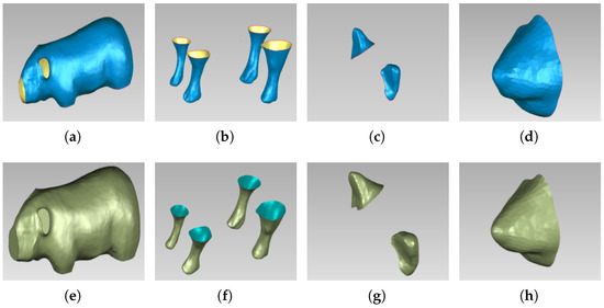 Polygon mesh model and surface model of different parts: (a) Polygon mesh model of pig body; (b) polygon mesh model of pig legs; (c) polygon mesh model of pig ears; (d) polygon mesh model of pig head; (e)surface model of pig ears; (f) surface model of pig legs; (g) surface model of pig ears; (h) surface model of pig head.
