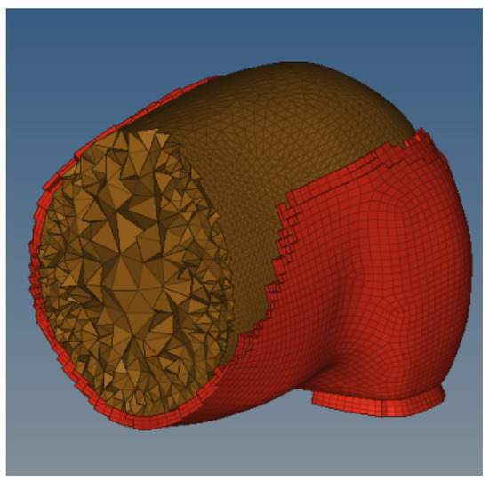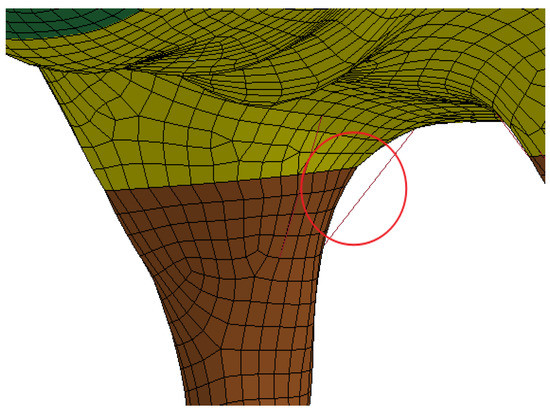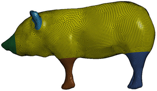 In terms of the anatomical structure of organisms, living intruders are composed of muscles, bones, organs, and other tissues. Organ-level and mass-block models are the two major types of organism models currently used, with the former being computationally intensive and the latter being too simple. In the study of high-speed collisions between trains and living intruders, on the one hand, the survival probability of living intruders is extremely low, and there is no need to examine the damage of living intruders; therefore, the organ-level modeling of live intruders is not required. On the other hand, to accurately simulate the collision energy absorption characteristics of living muscles and bones during collisions, it is not appropriate to use the simplified mass block model. Here, the filled 3D laminated finite element model is proposed to ensure the collision simulation resembles a real-world situation. Take the pig model as an example and divide the grid as follows.