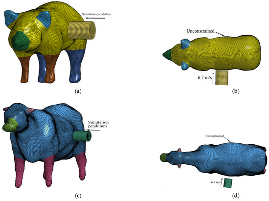 Simulation of pendulum side impact for laminated model: (a) Pig model side-impact model; (b) pig model simulation condition setting; (c) cow model side-impact model; (d) cow model simulation condition setting.