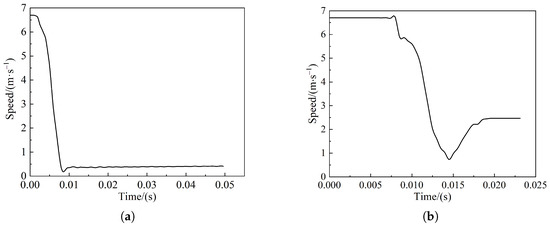 Figure 12 shows the pendulum velocity versus the time course curve when the pendulum impacts the side of the living body with an initial velocity of 6.7 m/s. In Figure 12a, the pendulum is blocked after contacting the live body, and the speed drops rapidly, reaching a minimum value of 9 ms; energy is absorbed through the deformation of the skin, muscles, and bones during the speed drop; after the velocity reaches the minimum value of 0.2 m/s, the energy generated by the pendulum is fully absorbed by the body, at which time the living body muscle and bone produce rebound and the velocity rises to about 0.5 m/s. The speed of the pendulum in Figure 12b drops to 0.7 m/s and then rises to 2.5 m/s with the same trend. The difference is related to the angle and position of the pendulum.