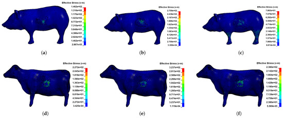 Stress clouds of the living body at each moment of the collision simulation: (a) Stress cloud at the moment before the maximum stress in the pig model; (b) stress cloud at maximum stress in the pig model; (c) stress cloud at the moment after the maximum stress in the pig model; (d) stress cloud at the moment before the maximum stress in the cow model; (e) stress cloud at maximum stress in the cow model; (f) stress cloud at the moment after the maximum stress in the cow model.