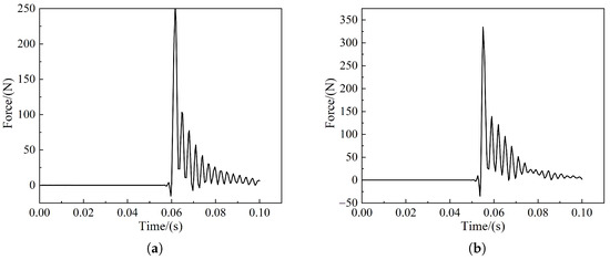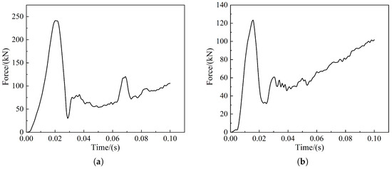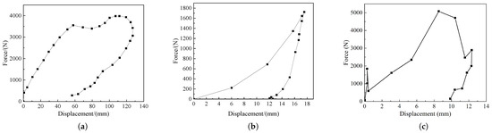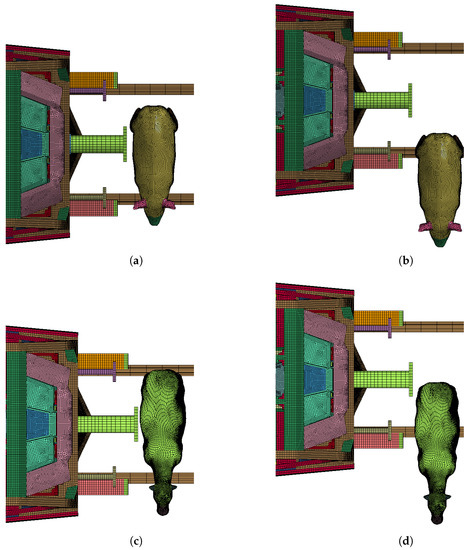 Figure 14b,c show the live model impact force–time curve, Figure 15b,c show the live model impact force-displacement curve, and Figure 14a and Figure 15a show the impact force–time curve and impact force–displacement curve of the test results in the literature [25], respectively. From Figure 12 and Figure 13, it can be seen that the results of the live model calculations are in good agreement with both the human test results and simulation calculations in the reference [25], and the results indicate that the impact force reaches its maximum value at about 40% of the total calculation time; furthermore, the contact force continues to rise with the increase in displacement, while contact ends at 25% of the return displacement. The differences in the magnitudes of contact and impact forces observed in the literature are due to inconsistencies in the material parameters of the laminated model, and the deviations in the values are within the allowable range. The simulation results show that the 3D finite element laminated model of the live intruder can reduce the workload of finite element model building, reduce the calculation volume, save time and improve efficiency, and at the same time, it can accurately reflect the deformation of the animal body during the collision to meet the subsequent calculation requirements.