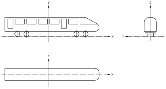 For finite element modeling, the following Cartesian coordinate system is used: the x-axis is positive along the longitudinal direction of the train and to the right, the z-axis is positive along the vertical direction of the train and upward, the y-axis is positive along the constant direction of the train, and the coordinate axes are arranged by the right-hand rule, as shown in Figure 16.