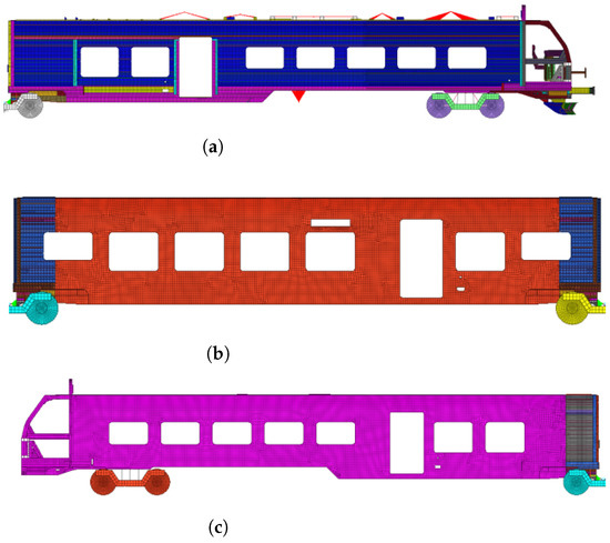 Finite element model of the train: (a) Finite element model of the head car; (b) finite element model of intermediate vehicle; (c) finite element model of the tail train.