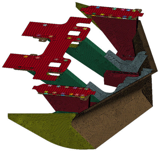 Figure 17 shows the mesh model of the head car, tail car, and intermediate car of the train. The whole train contains 1,849,745 nodes and 2,019,890 elements, including 1,833,721 shell elements, 342,215 3D solid elements, 44 mass elements, 81 spring elements, 126 nodal rigid bodies, 64 beam elements, and 7 flexible connection elements. The typical material parameters of the finite element model of the train are shown in Table 6.