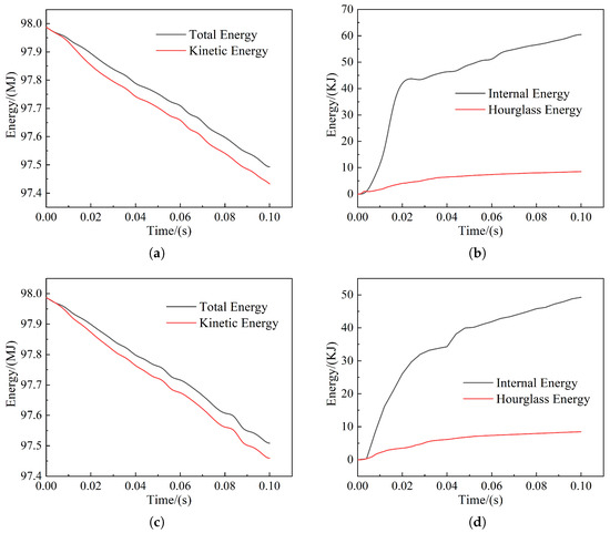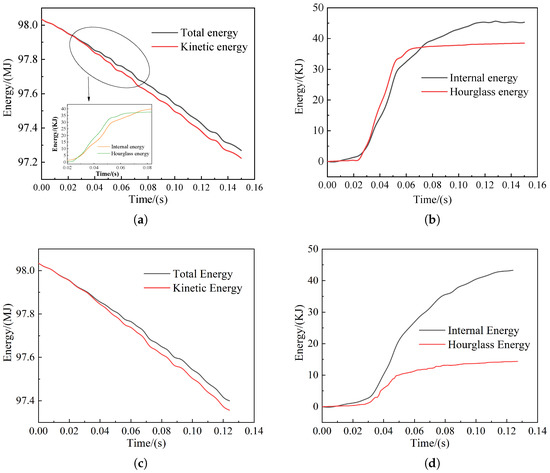 Collision energy curve: (a) Total energy and kinetic energy curve of frontal collision of cow; (b) internal energy and hourglass energy curve of frontal collision of cow; (c) total energy and kinetic energy curve for cow bias collisions; (d) internal energy and hourglass energy curve for cow bias collisions.