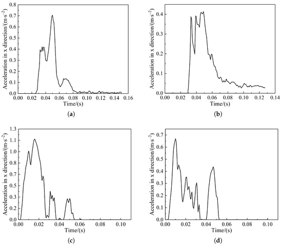 Acceleration curves of the train: (a) Pig head-on collision; (b) Pig offset collision; (c) Cow head-on collision; (d) Cow offset collision.