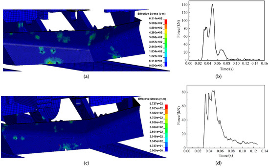 Changes in force on the cowcatcher: (a) Effective tress cloud diagram of the cowcatcher at 55 ms of collision; (b) Force curve of pig frontal collision cowcatcher; (c) Effective tress cloud diagram of the cowcatcher at 88 ms of collision; (d) Force curve of pig offset collision cowcatcher.