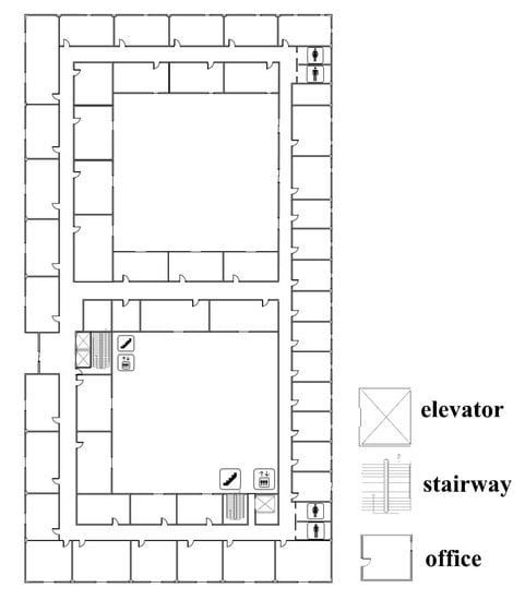 Without the need to install additional equipment, utilizing the map information based on building structures is a stable and cost-effective method for correcting an accumulated error. Most interior buildings are made up of corridors and rooms. We call the corridor paths the main indoor paths, which reflect the general situation of the interior of a building []. All the particles on the map can be repositioned according to the stride and heading obtained by the lower filter. During a particle propagation, map constraints are used to constrain the movement of particles. We create two different map constraints during the particle initialization and propagation, the PFXM and PFMK []. The PFXM indicates unconstrained mapping, where the particles can enter feasible and forbidden areas. In the PFMK, the particles are constrained to the main road and stairs of the building. The plane information is shown in Figure 2.