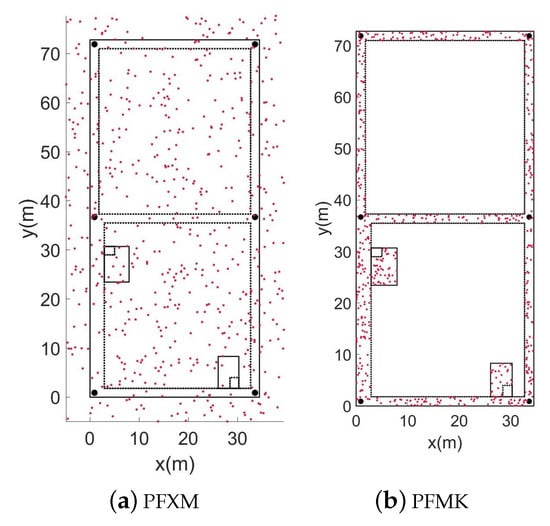 The PF is a recursive Bayesian filter using the Monte Carlo method. This filter represents the posterior probability density of random events through a set of random particle samples with weights in the state space and then estimates the state of the dynamic system from noisy or incomplete observation sequences. It can provide higher positioning accuracy in highly nonlinear problems with arbitrary distributions and has great flexibility in exploiting the indoor structural information of buildings [].