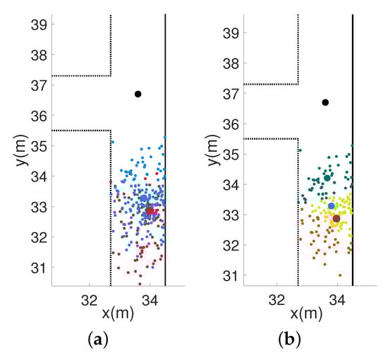 In Figure 4a, the red scatter points represent the original particle swarm, and the blue scatter points represent the resampled particle swarm. Figure 4b shows the results of the clustering analysis according to the weight on the resampled particle swarm. From Figure 4b, we can see that the position of the center point of the cluster with the highest weight is determined as the corrected position, which is the center position of the green particle cluster in the figure. The black dot is the position of the inflection point of the building’s map.
