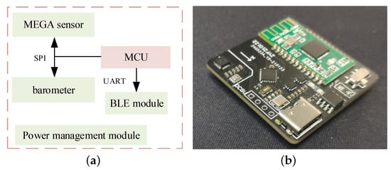 The hardware system mainly consists of an MAGR sensor ICM-2098, an air pressure sensor BMP280, a low-power MCU stm32L103, a communication module and a power supply module. The BLE5.0 is used for data communication, with size of 35 mm × 35 mm × 35 mm. The hardware system is powered by a 400 mAh lithium battery, which can be charged through the Type-C interface. On the premise of meeting the selection requirements, the hardware system should use chips with small size and low power consumption as much as possible to increase the working time and reduce the volume. The system hardware block diagram and physical diagram are shown in Figure 5.