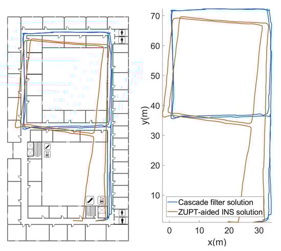 The orange trajectory in Figure 6 was obtained by attitude angle correction based on ECF and zero-velocity-update (ZUPT) correction. Because there is no fixed correction reference for the heading angle direction, the result has a certain accumulated error. The blue trajectory was obtained by the cascade filtering algorithm that combines particle filtering and map information. It can be seen that the cascade filtering algorithm effectively corrects the cumulative error of the heading angle and position in the lower filtering process.