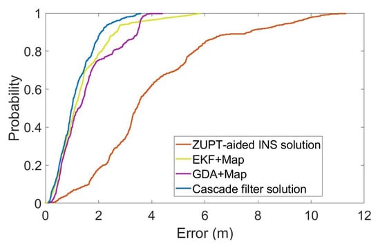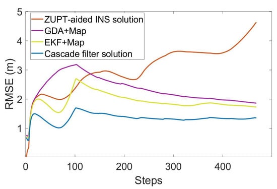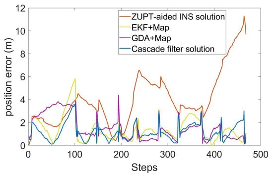 In order to evaluate the performance of the algorithm, we compared the ZUPT-aided INS method that does not contain map information, gradient descent algorithm (GDA) [], extended Kalman filtering (EKF) [] and cascade filtering algorithms that integrate the same map information. The position error and RMS error of different algorithms are shown in Figure 7 and Figure 8.