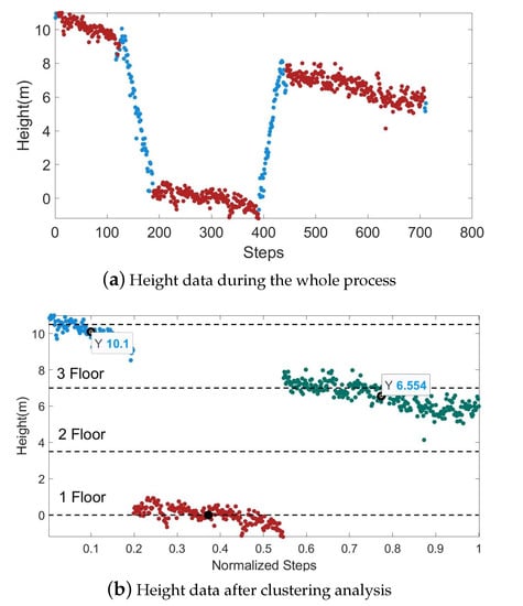 In Figure 10, the horizontal coordinates represent the number of pedestrian steps and the normalized results. The red scatter points represent the barometer data of the pedestrians on a certain floor before the height correction, and the blue scatter points represent the barometer data of the entire 3D positioning process after the correction. Figure 10b shows the result of the clustering analysis on the red scatter in Figure 10a, and the dotted line indicates the real floor height. In this experimental building, the height between adjacent floors is 3.5m. By calculating the mean value of the height data of the same cluster as the measured height of the corresponding floor, we get that the errors of the third and fourth floors are 0.45m and 0.40m. Combining the floor height information in the map, this error level will not cause an incorrect floor identification.