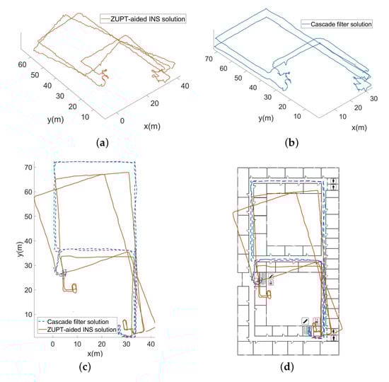 Figure 11a shows the 3D trajectory obtained by using the barometer data before correction and the ZUPT-aided inertial navigation algorithm. Figure 11b shows the 3D trajectory obtained by the corrected barometer data and the cascade filtering algorithm. The plane projection of the 3D trajectory restored by the two algorithms is shown in Figure 11c,d.