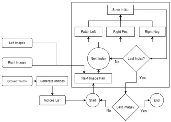 The inputs for this stage are represented by the left and right image pairs taken from the KITTI dataset, as well as their corresponding ground truth images. By processing them through the generate set and generate indices components, the array of patch examples is created, with one example containing the left patch, its corresponding patch from the right image (positive right patch), and its negative counterpart that provides an erroneous pairing. Besides the patches, another value is added and represents the corresponding image number from which the patches were taken. It was created as a side-effect from the optimizations decided for calculating the mean and standard deviation and has the role of indicating which precomputed values should be used on the patches.