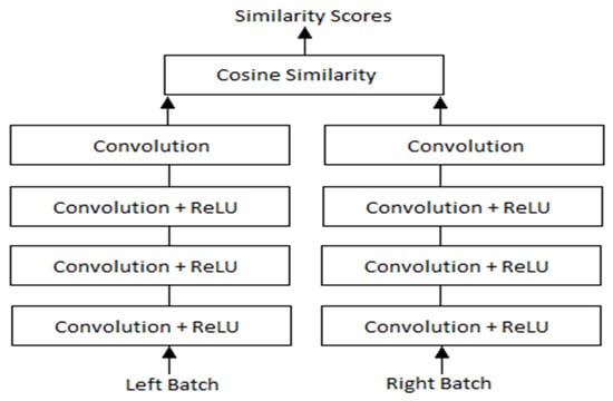 As Figure 3 suggests, the left and right batches of examples constitute the inputs for the network, which are propagated through the four convolutional layers and joined at the end by the aforementioned cosine similarity layer.