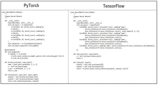 Following the diagrams for the components defined in Chapter 6, a multitude of functions and classes were created using each library, starting with the loss and the network architecture. For the network, both libraries allowed the creation of layers by extending a default module and using its predefined functions, access, then being done through an interface with two methods—one for data propagation and one for initialization. Figure 6 shows a side-by-side comparison of the written code in both libraries.