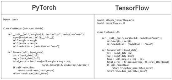 Regarding the loss algorithm, as it was a custom one, none of the libraries offered any closely related function to the required structure and inputs but instead offered ways to define the function in a way similar to how the network was defined. In all instances, the implementation of the algorithm was very similar, with the image that follows, presented in Figure 7, offering a visual comparison.