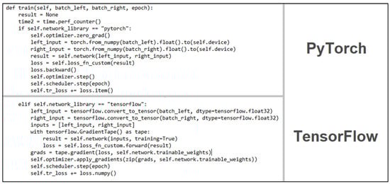 To emphasize the characteristics of each library, a complex task was created, starting with the work of Zbontar and LeCun [] in the depth estimation field. Their study focuses on a Siamese Neural Network that, when trained, outputs a depth map extracted from a stereo image pair. In our case, the algorithm starts by generating a set of 9 × 9 image pair patches from 200 stereo images contained in the KITTI Dataset 2015 []. Said patches are organized in positive and negative sets which are then normalized by subtracting the mean and dividing by the standard deviation and are used in the network during training in a supervised manner []. The architecture of the network is composed of four convolutional layers with a kernel size of 3, 64 output channels, and padding enabled. Each layer is followed by a rectified linear unit (ReLU), the only exception being the last convolutional layer. When an input batch is received, the left and right images are taken through the layers, with their results then being unified using a cosine similarity layer. During training, the library to be used can be chosen dynamically and the network’s parameters are initialized [] using the Xavier Uniform. The map obtained from the layers is then compared with the ground truth of the set to obtain the loss value of the example. This process is done through a custom hinge loss with an error margin set to 0.2 []. The resulting loss is then used in a stochastic gradient descent optimizer with a momentum set to 0.9 and a learning rate of 0.002 for the first 10 epochs and 0.0002 from epoch 11 onwards. The network is trained for a total 14 of epochs, with each epoch processing the whole dataset of around 17 million examples in batches of 128. The accuracy of each epoch is calculated by determining how many positions satisfied the error margin of 0.2.