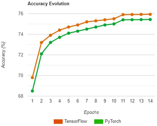 With all the above, each study provided competitive accuracies compared to methods that are specific to their domains, however, in most cases, only the chosen libraries were used, leaving the possibility of further improvements by implementing said models in a framework that is better suited for the task. Comparisons between frameworks have been made with this goal in mind, one such example being the work of Gurucharan M. K. in TensorFlow vs. PyTorch—Convolutional Neural Networks (CNN) []. In it, the author performed a comparison by using the Fashion MNIST dataset and LeNet 5 architecture, in the end, obtaining a leading accuracy of around 2% in favor of TensorFlow. However, most comparisons focus only on certain aspects of the libraries and do not take into account how the said library would integrate into an existing system or how suited it is for a specific task.