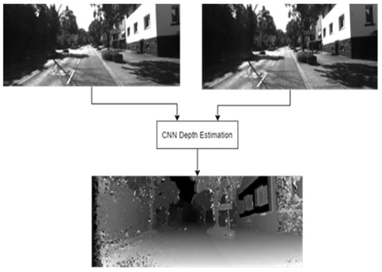 For the evaluation step, an actual depth map of a pair of examples was used to calculate an error rate value following the guidelines of Zbontar et al. []. Figure 11 offers an example of the system’s inputs and output, with the inputs being a pair of stereo images taken from the KITTI dataset [].
