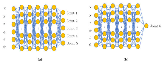 NN architecture for IKP. (a) NN for the first five joints; (b) NN for the last joint.