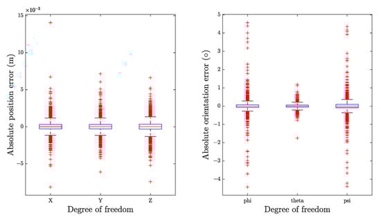 To evaluate the performance of the error minimization algorithm, both the initial and optimized solutions were transformed into the Cartesian Space. After subtracting the goal poses, the absolute errors of the initial and optimal solutions were obtained and plotted as boxplot in Figure 6 and Figure 7, respectively. Some error indicators were sorted and given in Table 7 and Table 8.