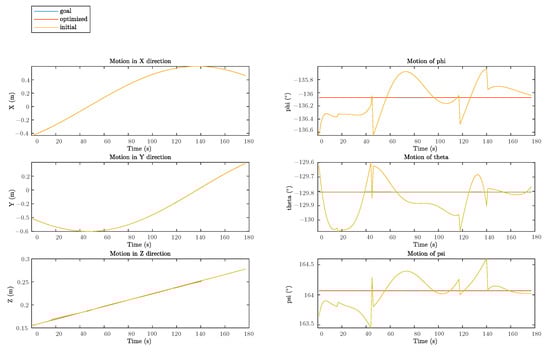 Plot of the goal trajectory, as well as that originating from the initial and optimized solutions, is shown in Figure 8. Respective decoupled motions, including rotation and translation in each direction, are illustrated in Figure 9, whereas Figure 10 describes the error of pose w.r.t. time.