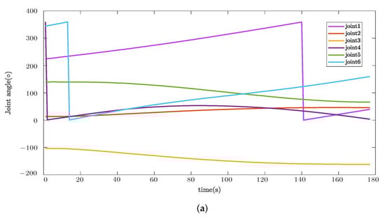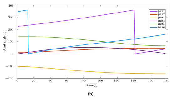 Additionally, joint motion results during the trajectory tracking task are plotted in Figure 11. Since the discontinuities in figures are caused by passing from to , which is a continuous motion in reality, it is proved that the system can give smooth solutions for a specific trajectory.