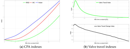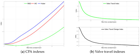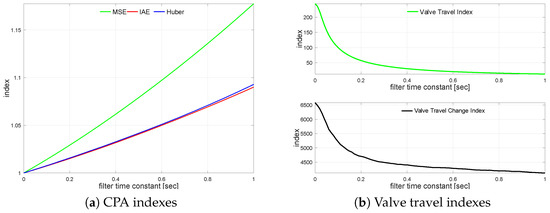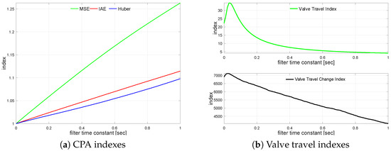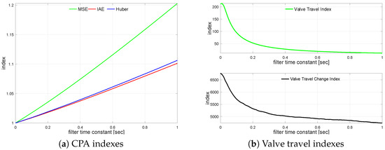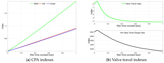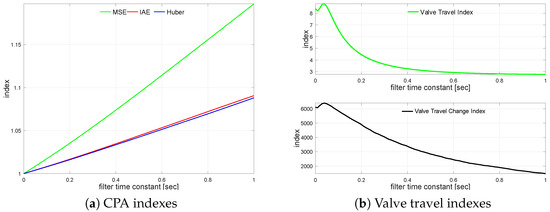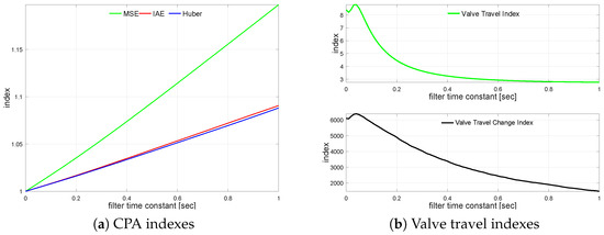 Next, the controlled variable measurement, i.e., the process output filter, is turned on. The loop is simulated with different filter time constants varying from s up to s incremented every 0.01 s. The impact of the control error filter on the loop performance is presented in Figure 7a. It shows relative index change versus the unfiltered case. A similar relationship for valve travel indexes is sketched in Figure 7b.