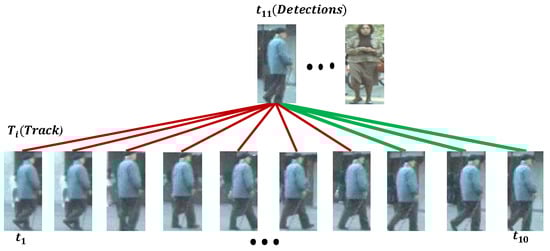 where is a j-th trajectory, is a learning parameter, and is a memory tracklet’s similarity score of the object belonging to that trajectory against the matched detection. are detected features at the current time t. The details of our proposed matching function are illustrated in Figure 2. The represents the history length, as shown with the red color edges in Figure 2, and K represents the recent history length as shown with the green color edges in Figure 2. If the recent history is unreliable, then the history portion contributes to the score and vice versa. The long-term appearance module is used to produce the similarity matrix. Finally, the computed similarity matrix is used for the Byte association. In the ByteTrack algorithm, we have used a matching score on the similarity matrix to make non-matching candidates score zero. The track initiation and deletion threshold are used to control the track’s birth and death.