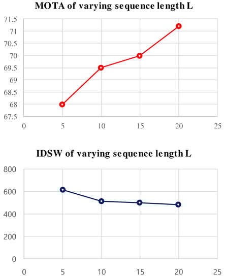 Discriminative appearance matching is used to formulate the similarity matrix from the reid features. We experimented with different lengths L and K for the long-term appearance matching and showed the performance on the MOT17 training benchmark in Figure 3. In order to select a correct length, we tune the ( and ), ( and ), ( and ), and ( and ) and observe the MOT accuracy and ID switching on the dataset. In Figure 3, we have demonstrated the performance of different lengths on the MOT15 training dataset. We observed the ID switching and MOT accuracy metrics to choose a correct and .