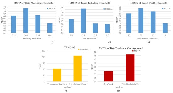 Effectiveness of our method on the MOT17 Training dataset: (a) MOTA of matching thresholds in Reid function; (b) effective track initiation thresholds on MOTA; (c) effective track death thresholds on MOTA; (d) average inference time; (e) effectiveness of Reid features.